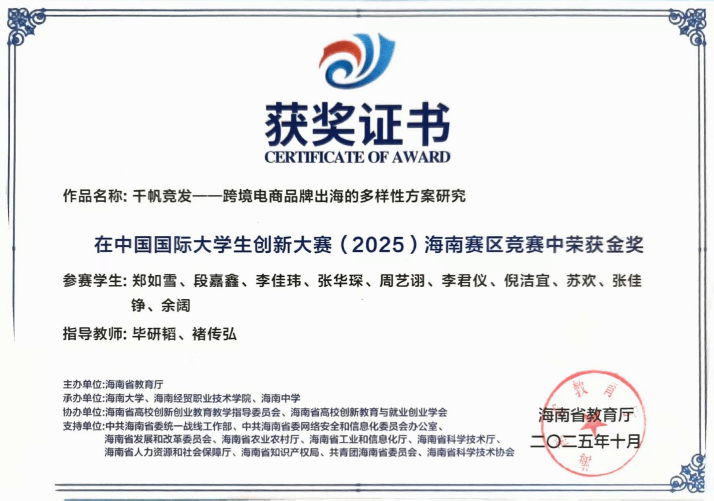 近日,中国国际大学生创新大赛(2025)海南赛区获奖名单公布,秘密花园 传播学系2023级本科生郑如雪带领的团队,凭借作品《千帆竞发——跨境电商品牌出海多样性方案研究》荣获金奖,该项目指导老师毕研韬、褚传弘被评为“优秀指导教师”。