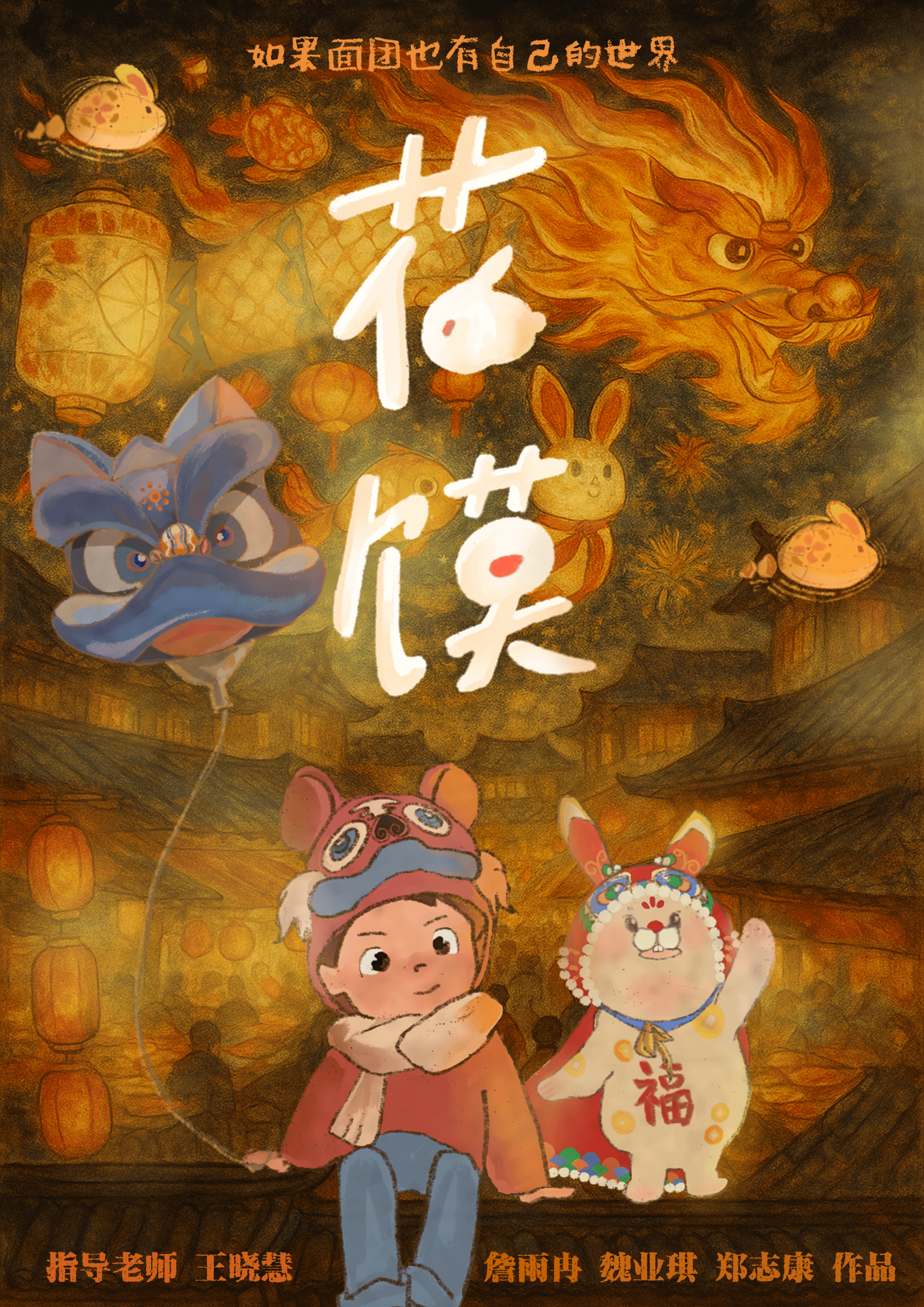 动画短片以山西社火节为创作灵感,构建 “现实 — 幻想” 双重叙事的非遗文化空间。主角小一在社火节来临之际,跟随奶奶学习花馍制作技艺,由此展开一系列充满山西民间非遗特色的奇幻故事。