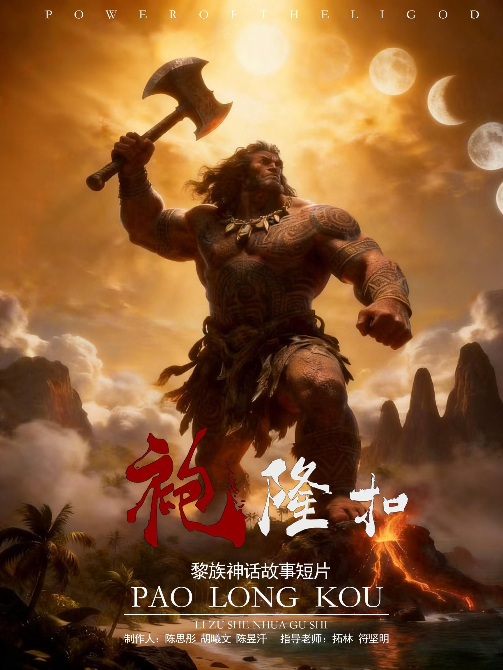 关于袍隆扣的传说版本众多,我们选择了其中一个故事。主要讲述了世界之初,袍隆扣开天辟地、射日射月、救原始黎民于水生火热后化作五指山的创世壮举。短片以写实的手法将神话故事真实再现,融合本创作小组三人的想法及审美来制作本短片。黎族神话大力神袍隆扣的传说为核心,旨在挖掘海南黎族原生文化内核,通过视觉化手段呈现黎族先民对天地起源的浪漫想象。