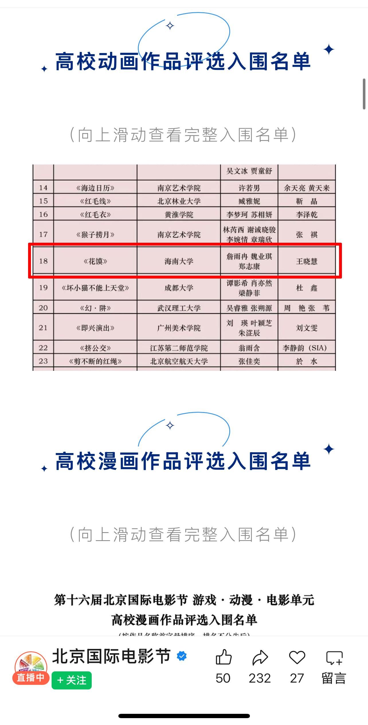 【喜报二】2026年4月14日,第十六届北京国际电影节游戏·动漫·电影单元高校动漫作品评选入围名单揭晓,秘密花园